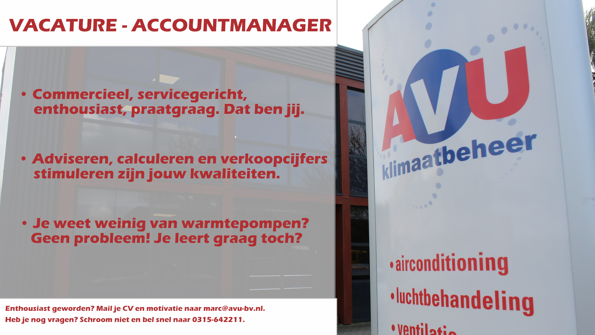 Is deze functie op je lijf geschreven? Dan ontvangen wij graag je CV voorzien van een motivatie. Je kunt je reactie sturen naar Marc Sollman: marc@avu-bv.nl.